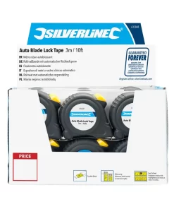 Scratch-resistant, nylon-coated blade. Clear metric and imperial graduations with highlighted joist marks every 16″. Automatic lock when extended, retraction button, triple-riveted end hook and belt clip. Measures internal and external lengths.